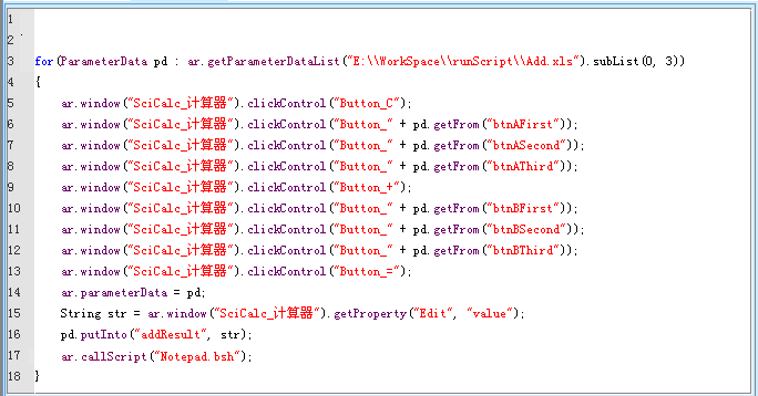 循環(huán)參數表執(zhí)行加法操作,第14句,這一句把臨時變量pd保存在了ar.parameterData參數中,因為在Notepad中還會用到pd參數。第15句獲得計算結果;第16句將結果保存到一個名為addResult的變量中,變量名可以是有意義的其他名字。第17句調用Notepad.bsh 保存計算結果。
