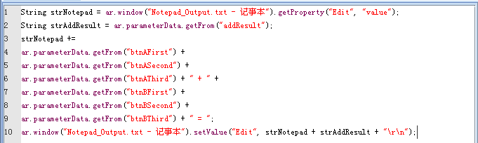 這段腳本先獲取計算器和記事本的值,第三句是將表達式的值拼接起來,重新設置記事本的值。注意:這里用ar.parameterData.getFrom("???")直接獲取xls表中的數據,因為在Calc腳本中ar.parameterData參數已經被賦值了。運行Calc腳本結果如下: