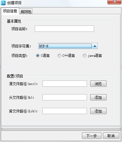 彈出新建項目對話框,如下圖所示,用戶根據(jù)自己需求填寫項目名,選擇項目字符集,項目類型。點擊瀏覽選擇源文件路徑,頭文件路徑和庫文件路徑。(路徑為要分析的項目的源代碼的路徑)(此處以C代碼,UTF-8為例)