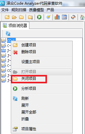 選中要關(guān)閉的打開狀態(tài)的項(xiàng)目,點(diǎn)擊文件下的關(guān)閉項(xiàng)目,如下圖所示,完成項(xiàng)目的關(guān)閉,已關(guān)閉的項(xiàng)目不能再展開查看源碼,不能進(jìn)行分析