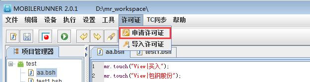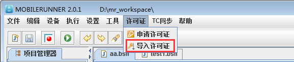 ● MobileRunner的試用期為15天,如果想長期使用需要申請license,申請license的過程: 打開軟件,點擊菜單【許可證】->【申請許可證】,按工具提示進行申請。