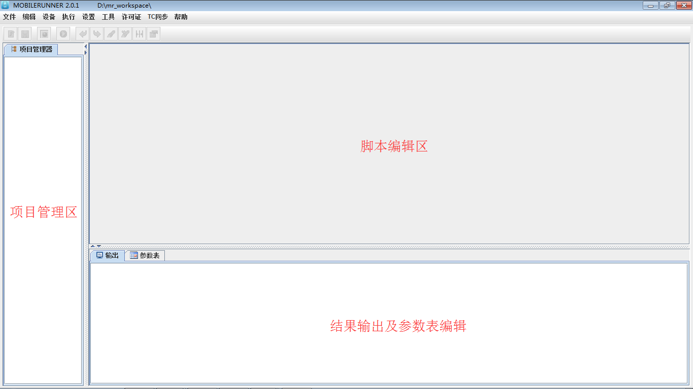 MobileRunner中的菜單欄如上圖所示,主菜單包含文件、編輯、設(shè)備、執(zhí)行、設(shè)置、工具、許可證、幫助等菜單項(xiàng),下面對(duì)每一項(xiàng)做一個(gè)簡介。