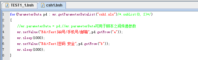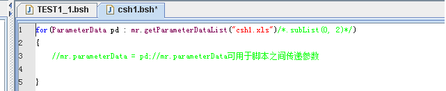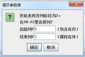 他會從參數(shù)表中提取信息,注意小括號中的文字,起始列是包含在內(nèi)的,而結(jié)束列被排除在外。點擊確定后腳本編輯器中會添加如下循環(huán)參數(shù)表代碼,這是一個循環(huán)結(jié)構(gòu)的空殼,它和參數(shù)表關(guān)聯(lián),參數(shù)表中的數(shù)據(jù)都是保存在和腳本同名的xls表中的。