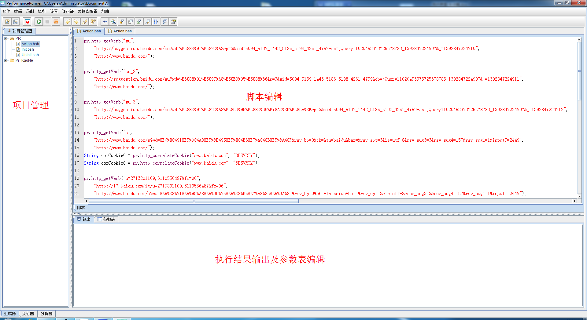 項(xiàng)目管理區(qū):創(chuàng)建項(xiàng)目,創(chuàng)建測(cè)試用例,進(jìn)行項(xiàng)目瀏覽,切換對(duì)象瀏覽,在PerformanceRunner中位于垂直拆分條的左邊;腳本編輯區(qū):對(duì)測(cè)試腳本編輯,在PerformanceRunner中位于水平拆分條的上部;結(jié)果輸出及參數(shù)表編輯:測(cè)試腳本標(biāo)準(zhǔn)輸出,查看測(cè)試信息,編輯參數(shù)表,在PerformanceRunner中位于水平拆分條的下部。