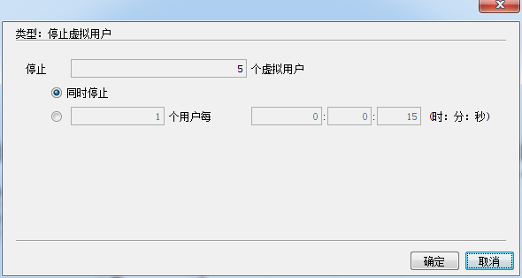 - 停止虛擬用戶:該項設(shè)定了所有虛擬用戶的停止方式,可以選擇所有虛擬用戶同時停止,也可以選擇一段時間內(nèi)停止指定數(shù)目的虛擬用戶。
