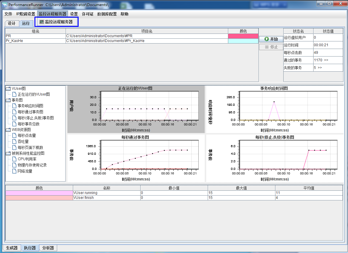 在界面輸入被測(cè)系統(tǒng)的IP地址,監(jiān)控器端口號(hào)(即在被測(cè)系統(tǒng)端設(shè)置的端口號(hào),默認(rèn)為22210),點(diǎn)擊開始監(jiān)控,連接成功,點(diǎn)擊“開始”運(yùn)行場(chǎng)景,在執(zhí)行器的圖表中即可看到被測(cè)系統(tǒng)的cpu利用率,物理內(nèi)存使用情況和網(wǎng)絡(luò)流量。