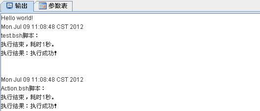 下面是一段Action.bsh中的腳本,用putInto命令將Hello world!字符串保存到名為param的變量用,變量名可以任取,其中parameterData是一個ParameterData類型的全局變量。接著是調(diào)用test.bsh腳本。