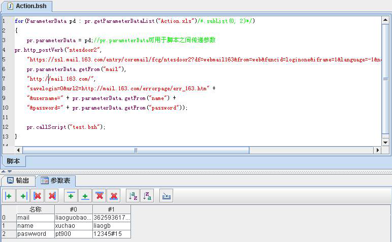 循環(huán)參數(shù)表執(zhí)行一個登陸操作,第3句,這一句把臨時變量pd保存在了pr.parameterData參數(shù)中,因為在test中還會用到pd參數(shù)。第12句調(diào)用test.bsh 打印參數(shù)結(jié)果。