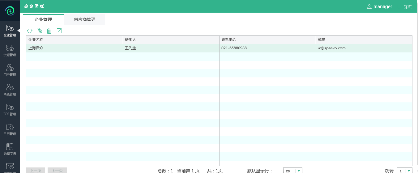 【添加】按鈕,彈出添加企業(yè)對(duì)話框,依次輸入企業(yè)名稱、聯(lián)系人、電話和郵箱,點(diǎn)擊【確定】按鈕,添加成功。
