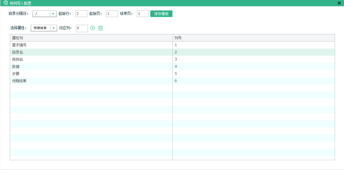 【導(dǎo)入模板配置】進(jìn)入到用例導(dǎo)入配置頁面,選擇目錄分割符、輸入起始行、起始頁、結(jié)束頁,選擇屬性,輸入對(duì)應(yīng)列,點(diǎn)擊