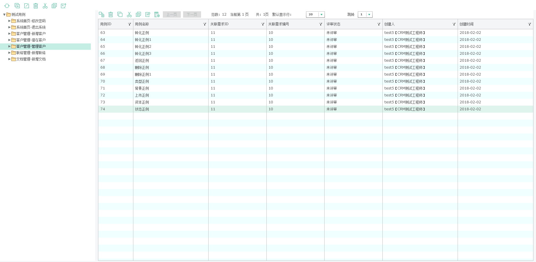 登錄測(cè)試工程師賬號(hào)test4、test5、test7,密碼111111進(jìn)入到CRM項(xiàng)目中,點(diǎn)擊【測(cè)試用例】進(jìn)入到測(cè)試用例模塊中。用戶test4負(fù)責(zé)系統(tǒng)首頁用例的編寫,用戶test5負(fù)責(zé)客戶管理用例的編寫,用戶test7負(fù)責(zé)聯(lián)絡(luò)管理和文檔管理用例的編寫。
