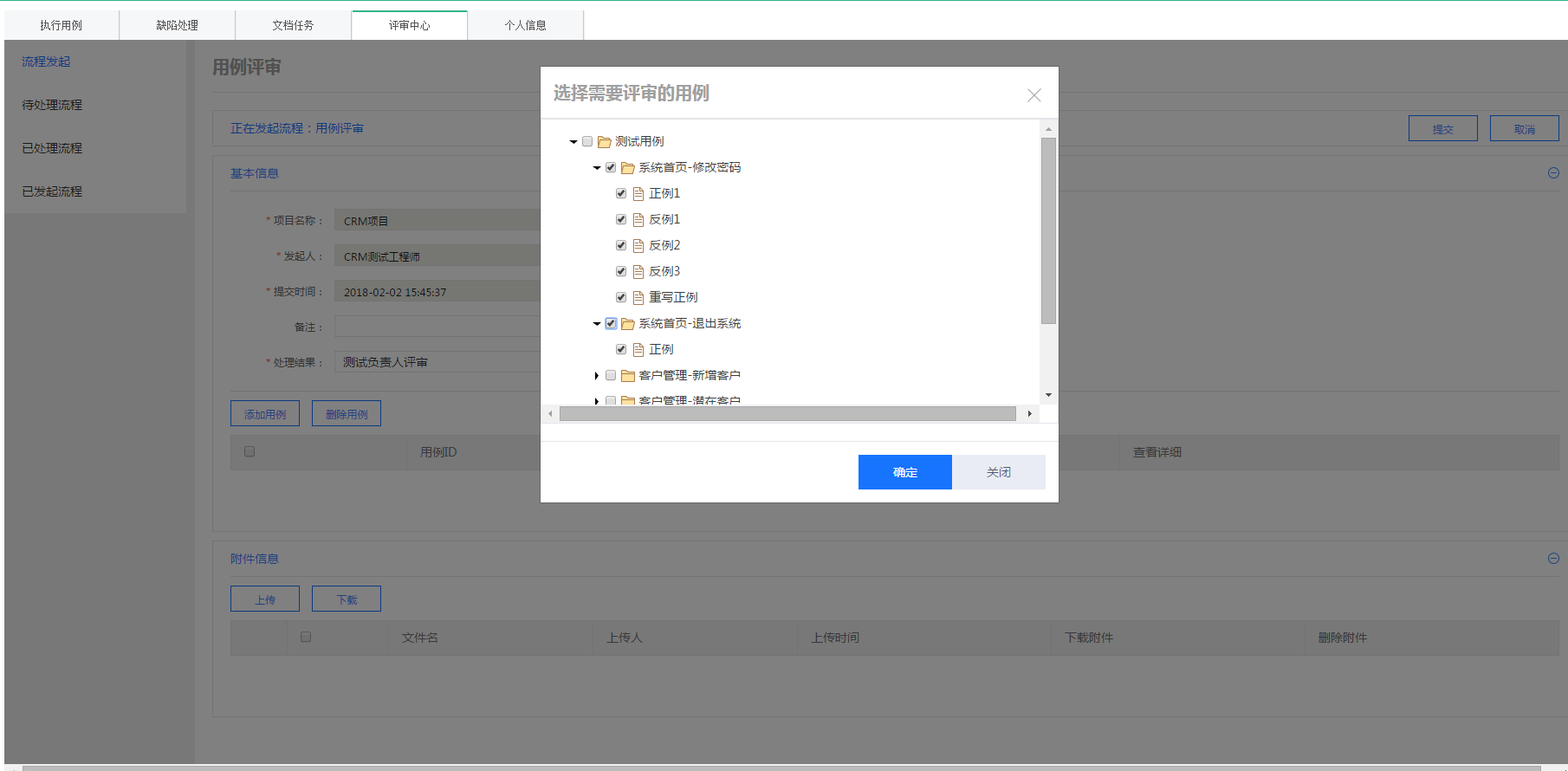 進(jìn)入到發(fā)起用例評(píng)審頁面,點(diǎn)擊【添加用例】按鈕,彈出選擇需要評(píng)審的用例頁面,勾選自己新建的用例,點(diǎn)擊【確定】按鈕,選擇用例成功。