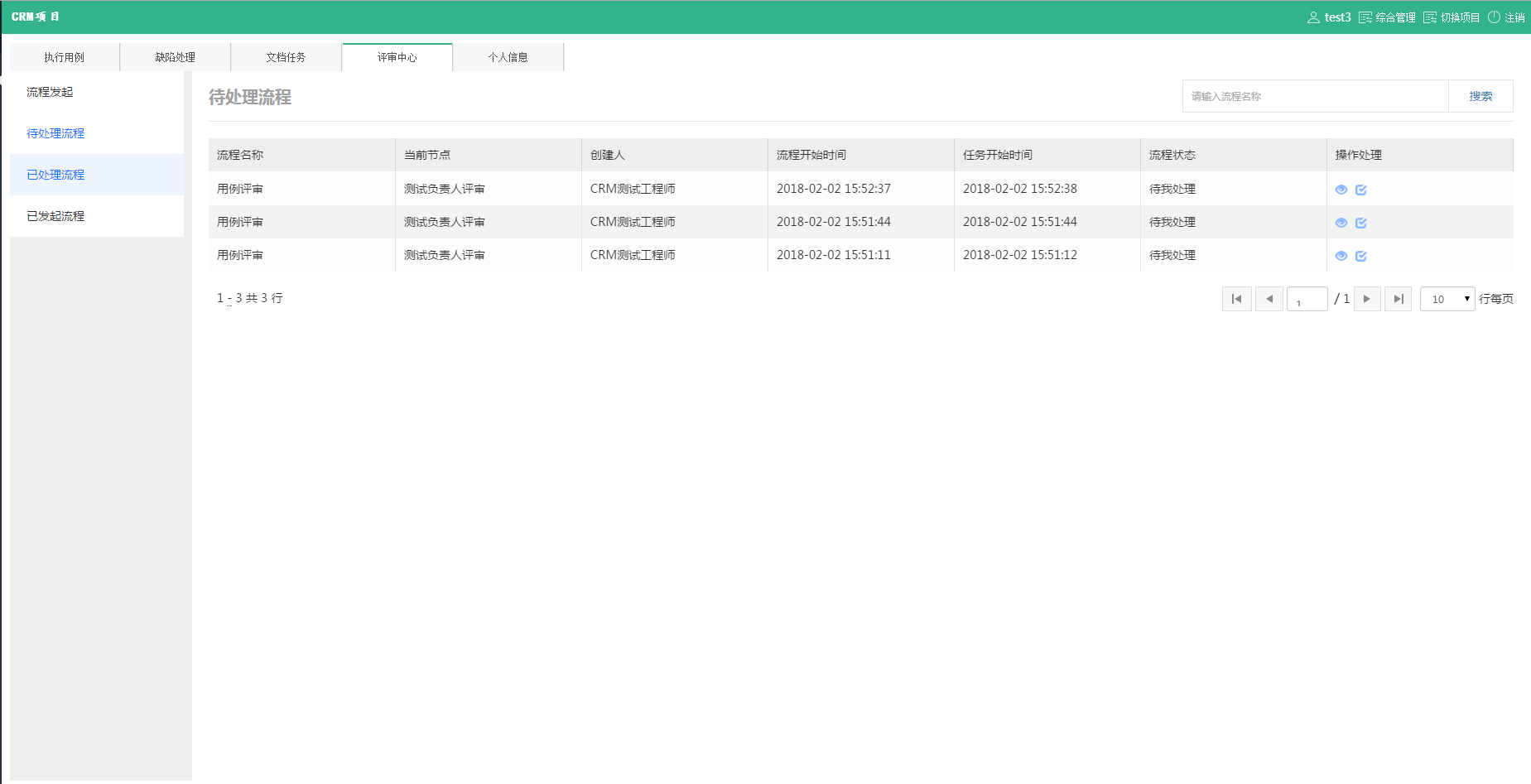 之后是測(cè)試負(fù)責(zé)人test3對(duì)發(fā)起的評(píng)審進(jìn)行評(píng)審。進(jìn)入到【個(gè)人中心】-【評(píng)審中心】-【待處理流程】頁面。