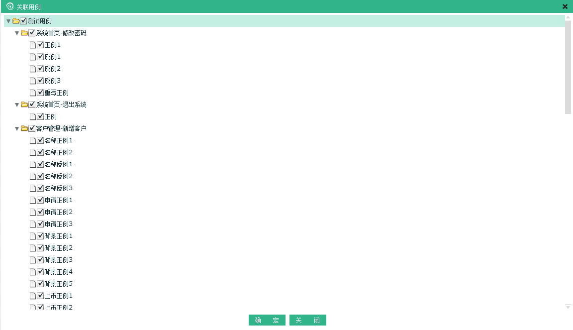 【添加用例】按鈕,彈出關(guān)聯(lián)用例頁面,勾選所有的用例,點擊【確定】按鈕,關(guān)聯(lián)成功。