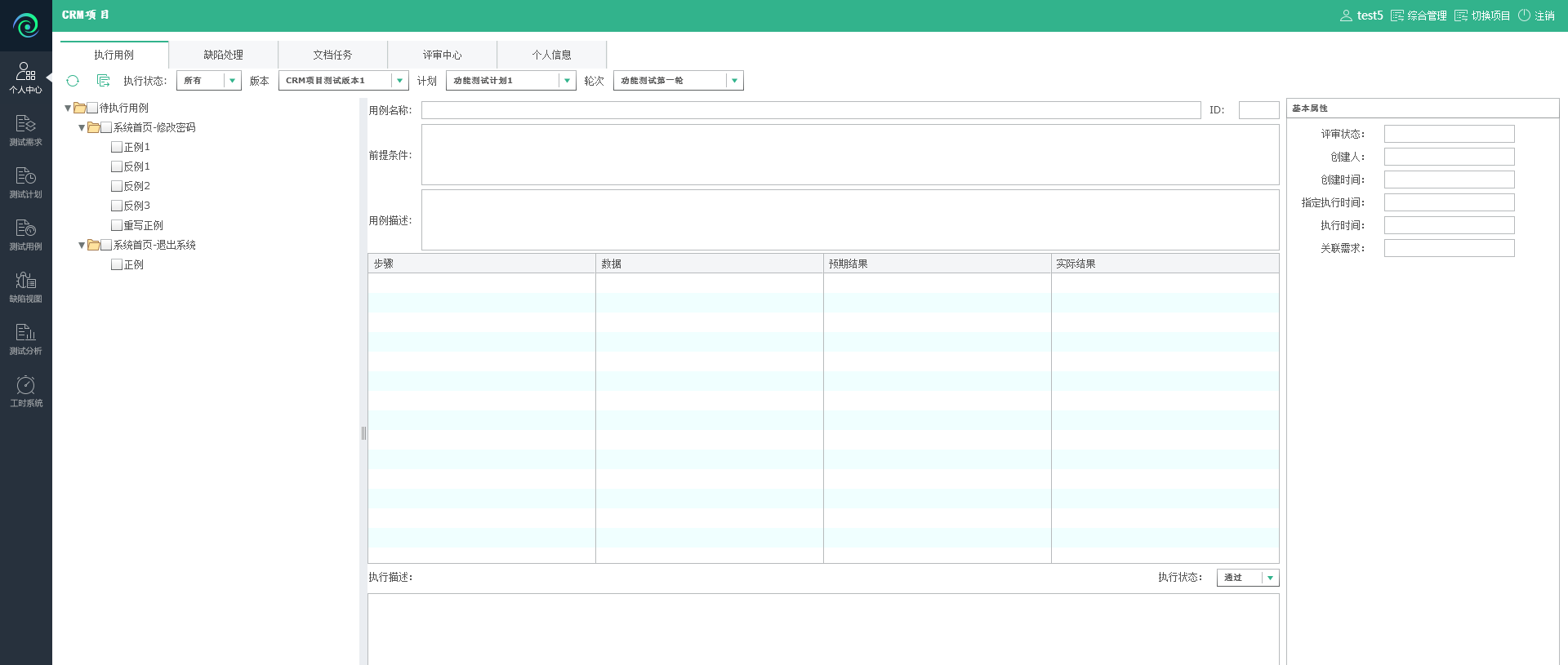 輪次用例分配給測試工程師后,測試工程師可以執(zhí)行用例。拿測試工程師test5來舉例,點擊【個人中心】-【執(zhí)行用例】進(jìn)入到執(zhí)行用例頁面,頁面只顯示已經(jīng)分配給test5的系統(tǒng)首頁用例。