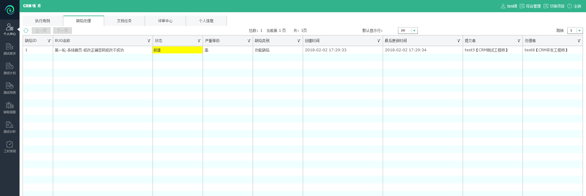 缺陷處理人-開(kāi)發(fā)工程師test8進(jìn)入個(gè)人中心-缺陷處理模塊進(jìn)行處理缺陷,缺陷處理完成后,缺陷會(huì)進(jìn)入下一個(gè)處理人的個(gè)人中心-缺陷處理模塊中。