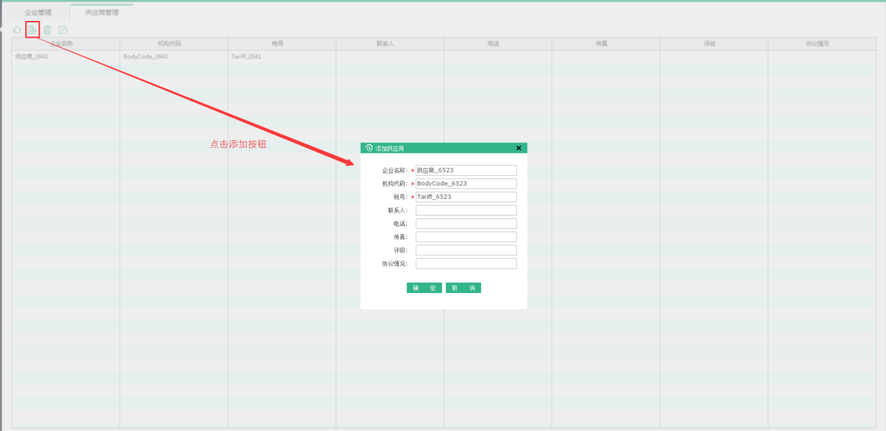 添加圖標(biāo),進(jìn)入創(chuàng)建供應(yīng)商界面,輸入相關(guān)信息,點(diǎn)擊確定按鈕,供應(yīng)商添加完成。