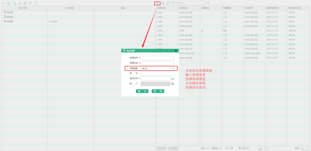 選中部門或不選中部門,點擊添加圖標,進入創(chuàng)建非人工/材料資源界面,輸入相關信息,點擊確定按鈕,非人工資源添加完成。
