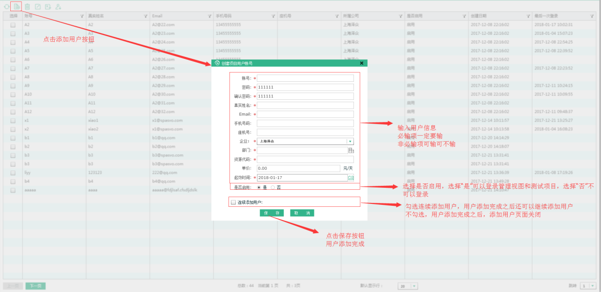 點擊添加用戶圖標,進入創(chuàng)建項目用戶界面,輸入相關(guān)信息,其中Email為你在項目中接收郵件的地址,點擊保存生成項目用戶,當然也可以勾選“連續(xù)添加用戶”連續(xù)添加。