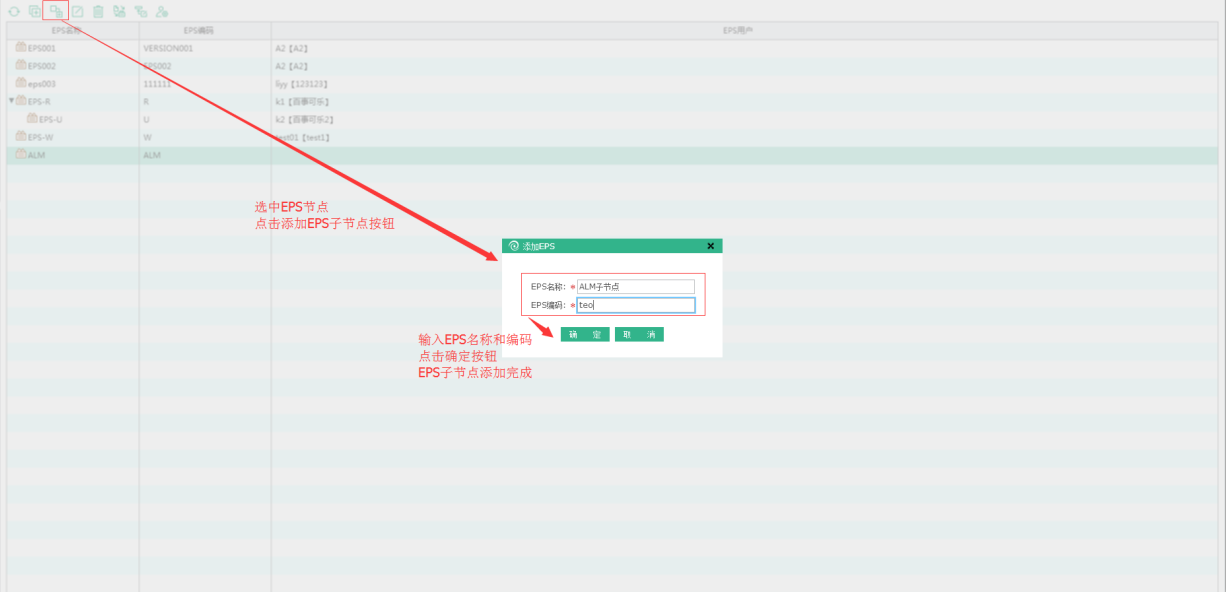 選中EPS,點擊添加子節(jié)點圖標,進入創(chuàng)建子EPS頁面,輸入EPS信息,點擊確定按鈕完成添加。