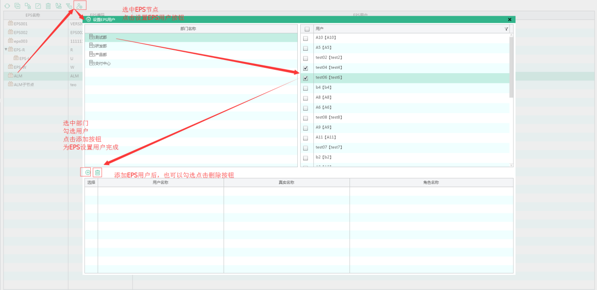 選中需要設置用戶的EPS,點擊設置EPS用戶圖標,進入到設置EPS用戶頁面,可以選擇部門下的用戶進行添加,該操作是為EPS設置EPS負責人。