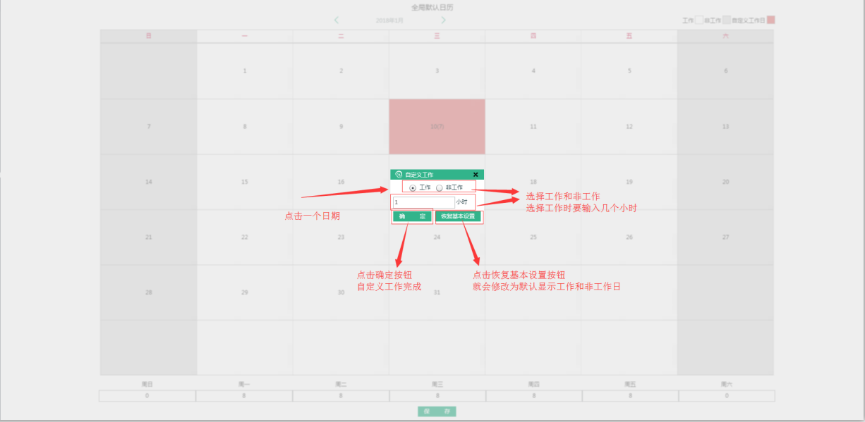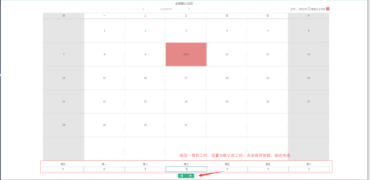點(diǎn)擊【日歷管理】進(jìn)入日歷管理模塊,日歷管理模塊主要是作為一個(gè)日歷模板,可以自定義工作日工作幾小時(shí)和非工作日,也可以修改一周的工作時(shí)間。