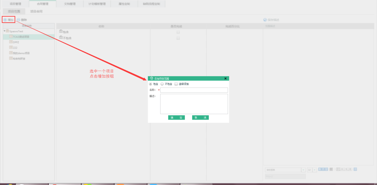 選中一個(gè)項(xiàng)目節(jié)點(diǎn),點(diǎn)擊增加按鈕,進(jìn)入添加項(xiàng)目范圍頁面,輸入信息,點(diǎn)擊確定按鈕項(xiàng)目范圍添加完成,當(dāng)然也可以勾選“連續(xù)添加”連續(xù)添加。