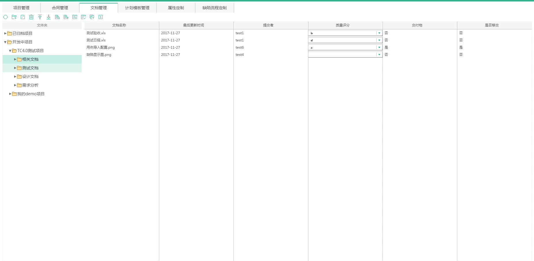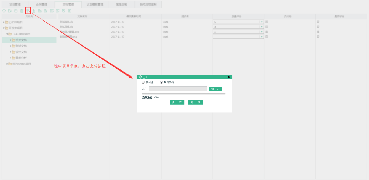 選擇文檔導(dǎo)入,選擇文檔的類別:交付物、項(xiàng)目文檔,點(diǎn)擊保存按鈕,文檔上傳完成,上傳之后可以在測(cè)試項(xiàng)目-個(gè)人中心-文檔管理模塊下查看該文檔。