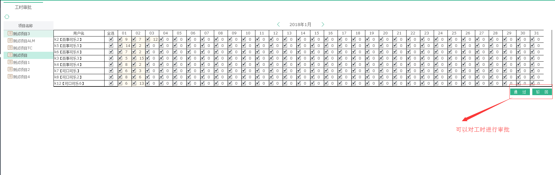 選中項目,會顯示項目中所有人的每一周的報工情況,進行審批,點擊通過或者駁回,完成審批。