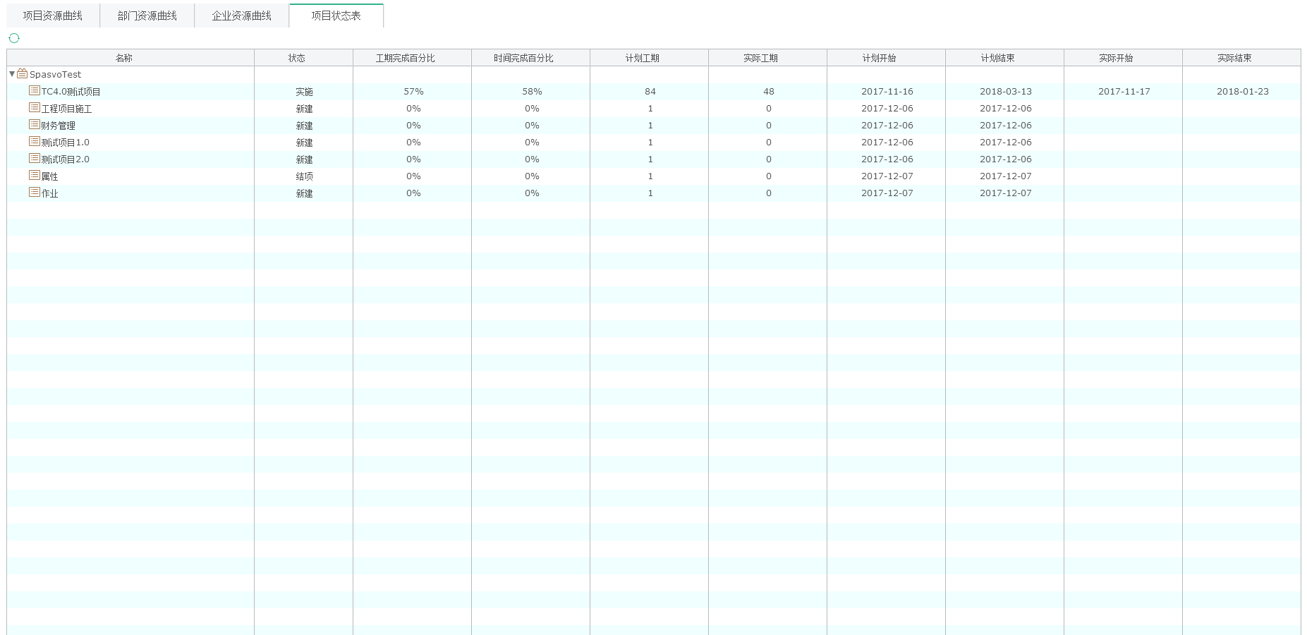 點(diǎn)擊【項(xiàng)目狀態(tài)表】進(jìn)入到項(xiàng)目狀態(tài)表模塊,顯示登錄用戶的新建項(xiàng)目和加入項(xiàng)目的狀態(tài)、工期完成百分比、時(shí)間完成百分比、計(jì)劃工期、實(shí)際工期、計(jì)劃開始時(shí)間、計(jì)劃結(jié)束時(shí)間、實(shí)際開始時(shí)間和實(shí)際結(jié)束時(shí)間。