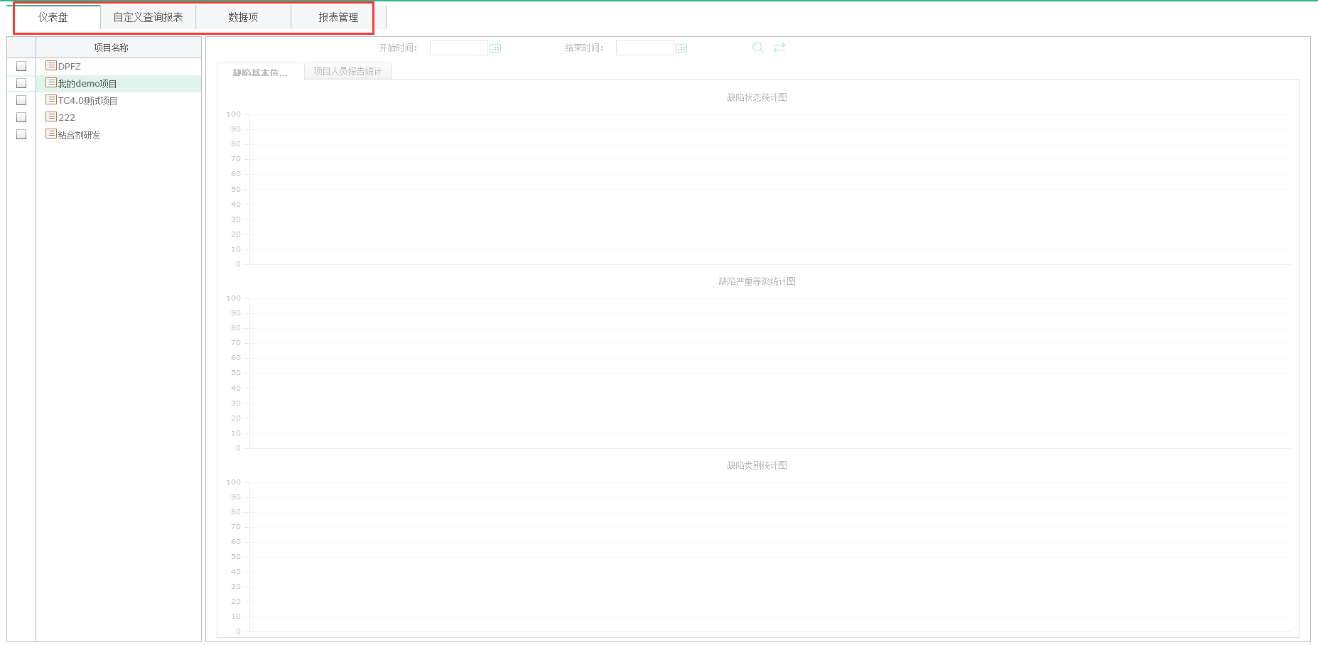 點(diǎn)擊【測試報(bào)表】進(jìn)入到測試報(bào)表模塊。測試報(bào)表模塊包含儀表盤、自定義查詢報(bào)表、數(shù)據(jù)項(xiàng)和報(bào)表管理模塊。測試報(bào)表主要是項(xiàng)目群管理人員根據(jù)項(xiàng)目進(jìn)行查看各項(xiàng)目的缺陷報(bào)表、各種測試指標(biāo)、自定義報(bào)表等。方便項(xiàng)目管理人員實(shí)施把控各項(xiàng)目的進(jìn)度情況。