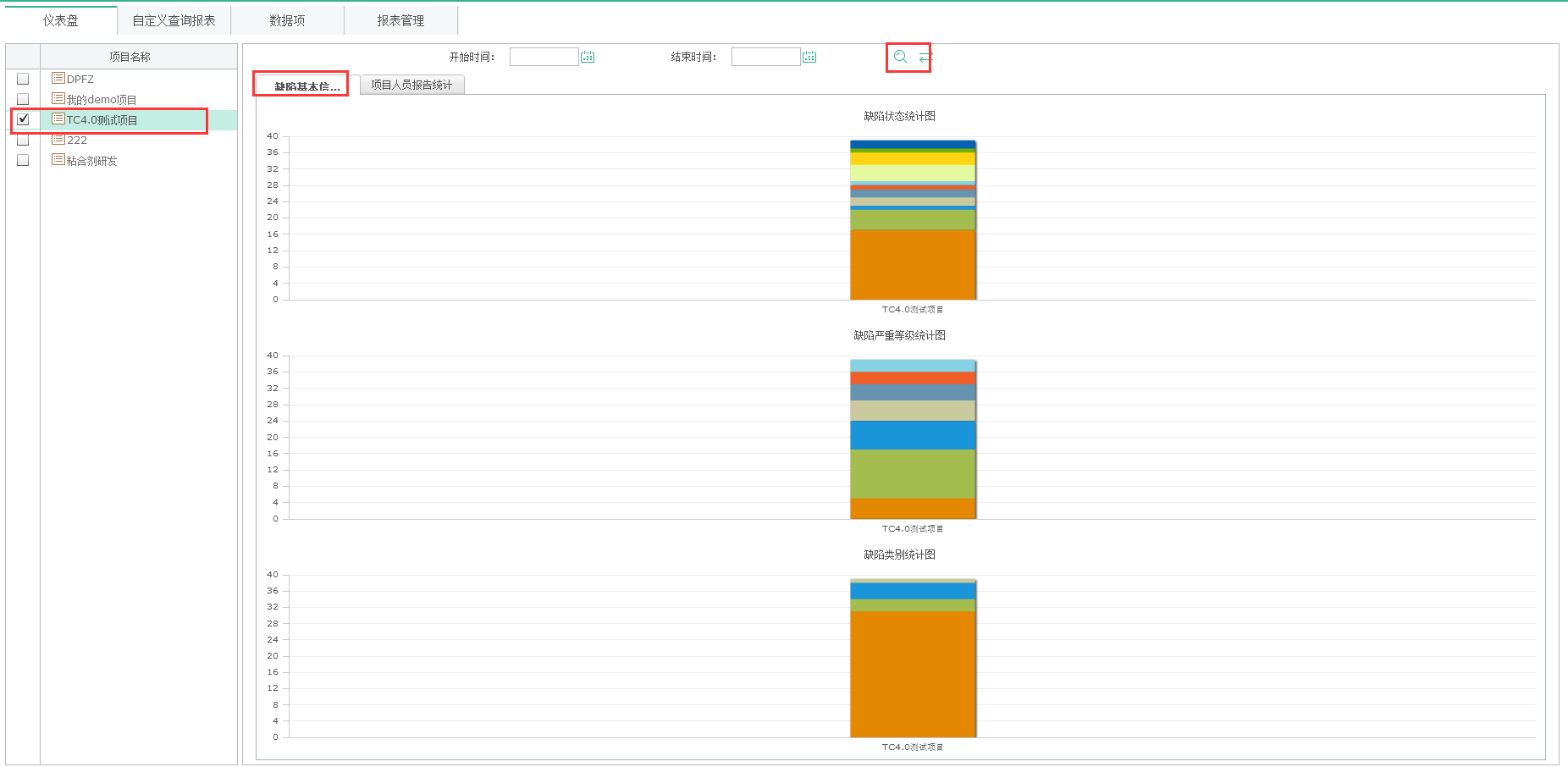 點(diǎn)擊【儀表盤】進(jìn)入到儀表盤模塊。儀表盤以項(xiàng)目為單位,給項(xiàng)目群管理人員進(jìn)行缺陷基本信息、項(xiàng)目人員報(bào)告統(tǒng)計(jì)。