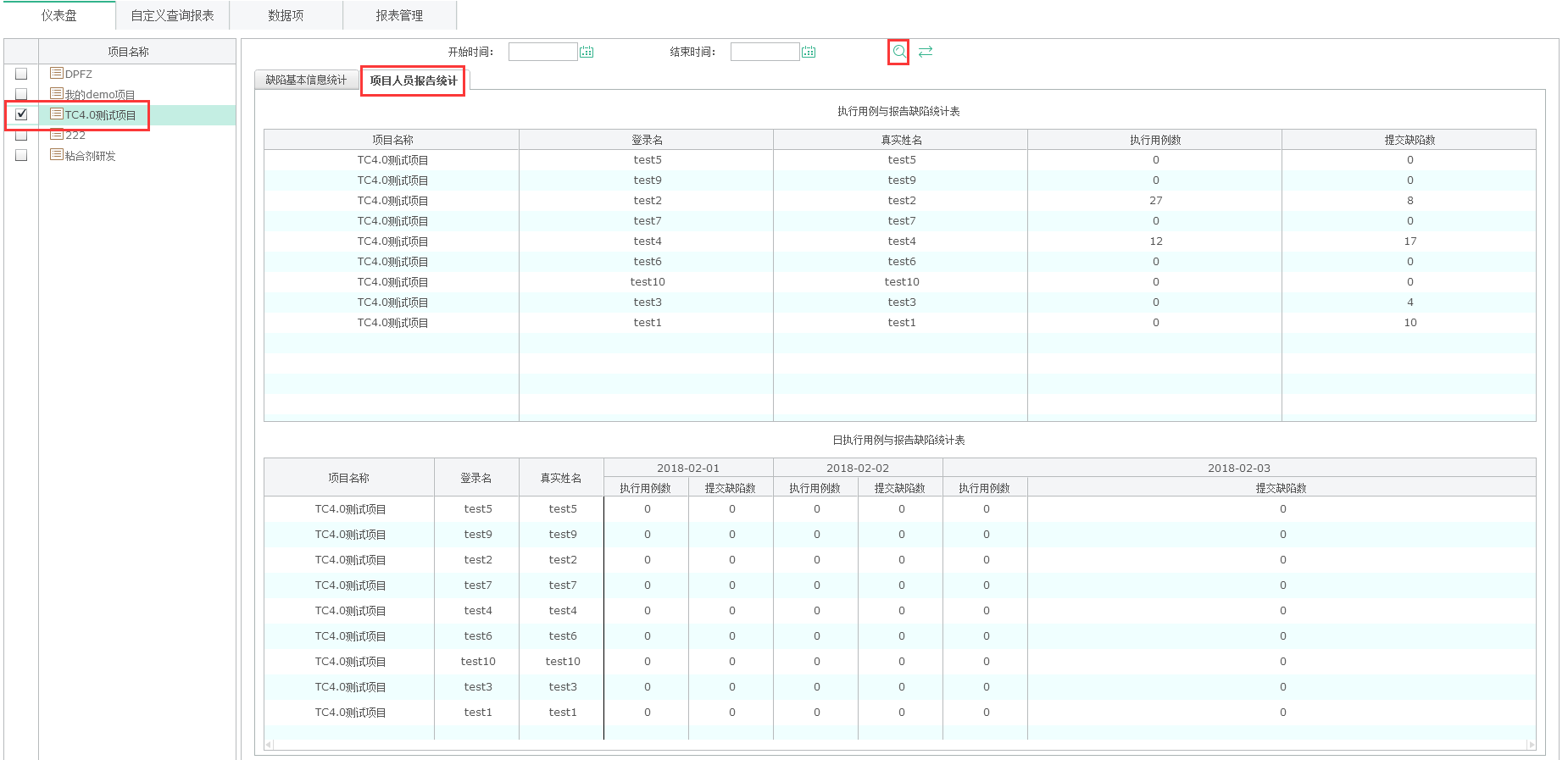 項(xiàng)目人員報(bào)工統(tǒng)計(jì):根據(jù)選中的項(xiàng)目,以列表的形式,對(duì)項(xiàng)目中人員提交的缺陷與執(zhí)行的用例進(jìn)行統(tǒng)計(jì),有執(zhí)行用例與報(bào)告缺陷統(tǒng)計(jì)表、日?qǐng)?zhí)行用例與報(bào)告缺陷統(tǒng)計(jì)表。