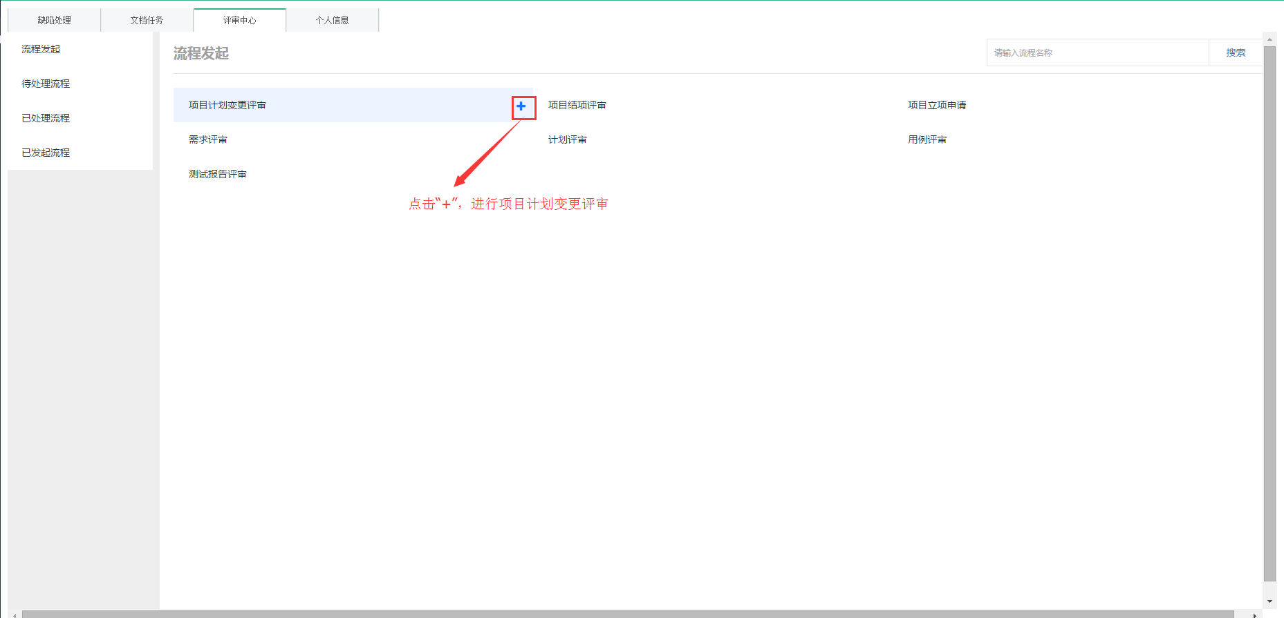 當項目在執(zhí)行中的時候,項目經(jīng)理希望可以看到項目進度,這在哪里呢?因為已經(jīng)創(chuàng)建了項目計劃,所以要對計劃進行評審,進入到【個人中心】-【評審中心】,點擊項目計劃變更評審的“+”按鈕
