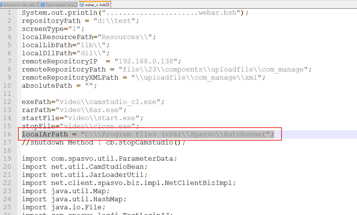 4、打開TestAgent根目錄,找到webar_c.bsh文件打開編輯,找到localArPath = "C:Program Files (x86)SpasvoAutoRunner";(其中=””中的路徑為AutoRunner實(shí)際安裝路徑)