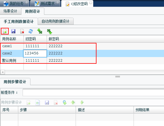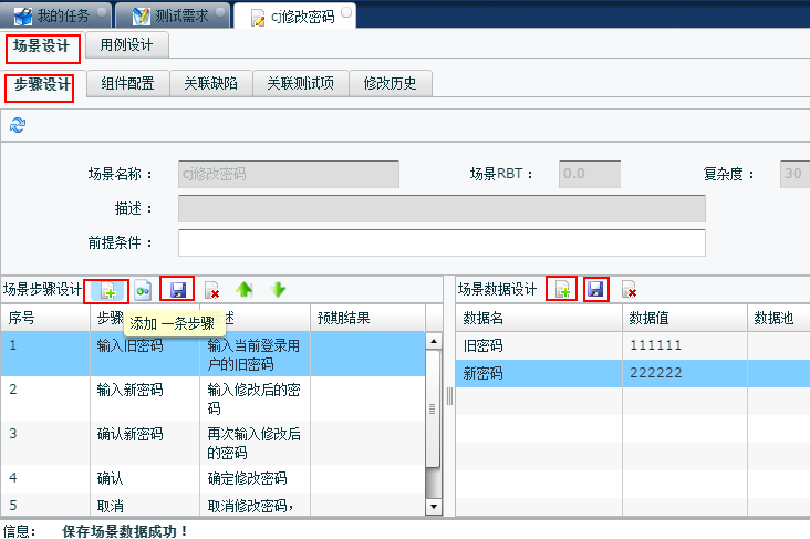 1. 場景步驟設(shè)計(jì),點(diǎn)擊添加一條步驟 2. 編輯各個(gè)步驟的步驟信息、描述以及預(yù)期結(jié)果 3. 點(diǎn)擊保存,添加成功 4. 場景數(shù)據(jù)設(shè)計(jì)同步驟1 2 3 |