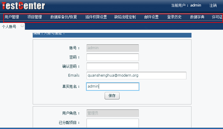 包括:【個人賬號】、【用戶管理】、【項(xiàng)目管理】、【數(shù)據(jù)庫備份】、【插件權(quán)限設(shè)置】、【缺陷流程定制】、【郵件設(shè)置】、【登陸歷史】、【數(shù)據(jù)字典】、【許可證】。