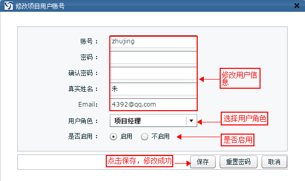 勾選需要修改的用戶,點(diǎn)擊【修改】按鈕,可修改用戶的基本信息,重置密碼則可將用戶密碼重置為111111。