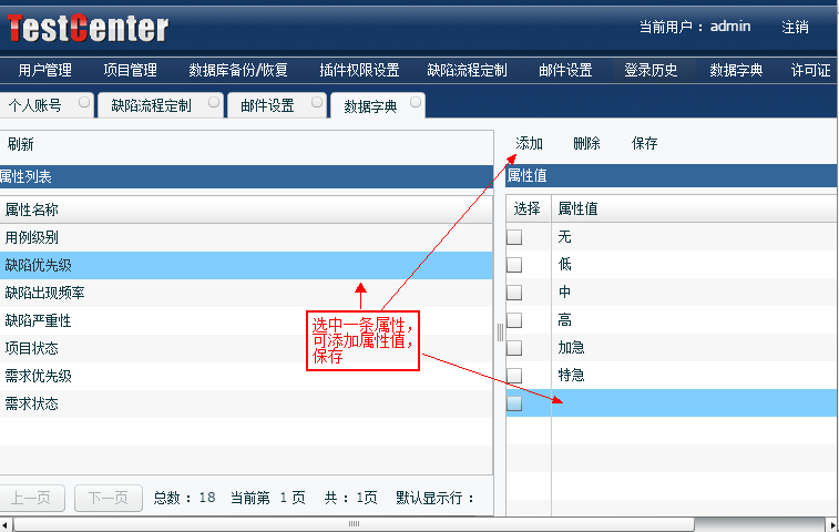點擊【數(shù)據(jù)字典】,進入數(shù)據(jù)字典模塊,這里主要是對項目模塊單選屬性,對屬性值進行添加、刪除和保存的操作。