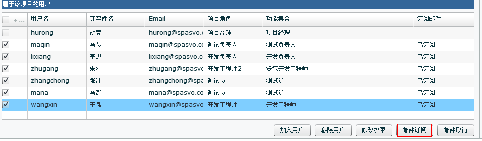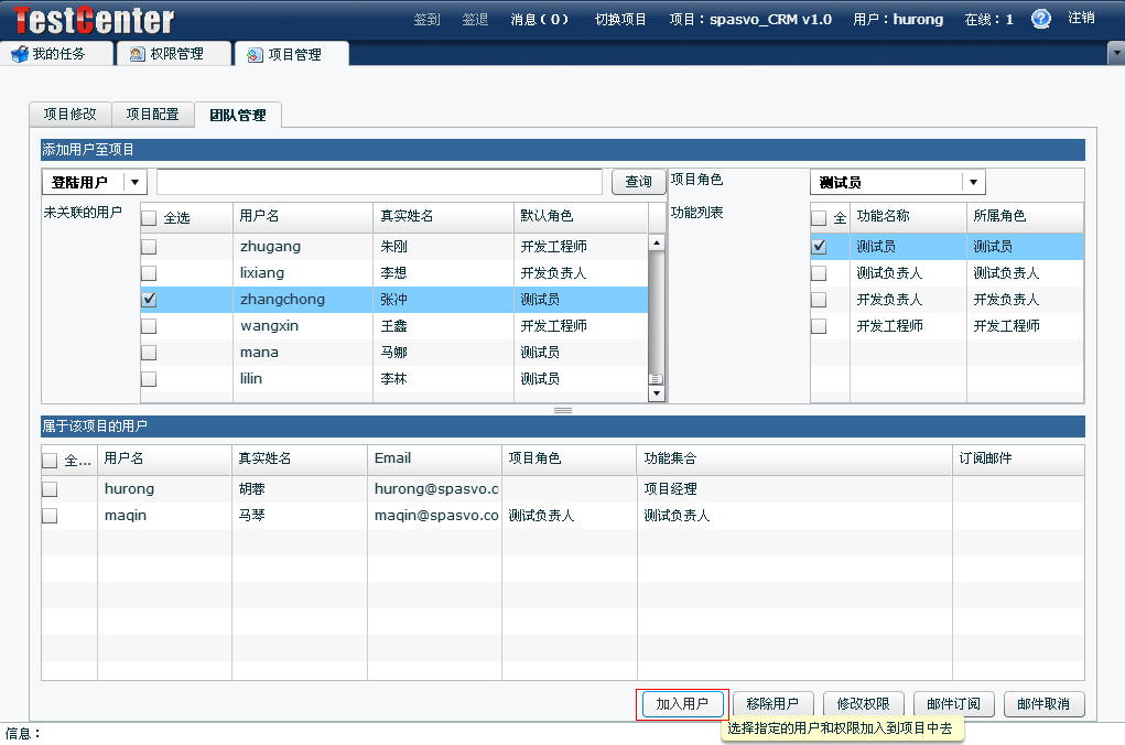 選擇要加入項目的人員,為他們分配角色與功能(這時候你會發(fā)現(xiàn)功能名與角色名一致的好處了),點擊“加入用戶”將他們加入你的項目團隊。
