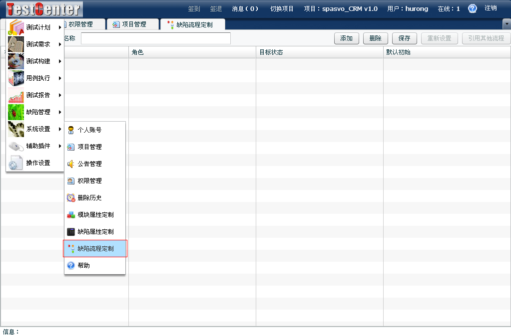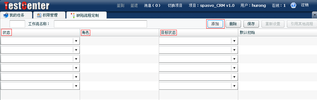 (注:這里的缺陷流程定制是在項目開始的時候定制的,一旦項目提交過缺陷以后,這里的缺陷流程便無法更改。)