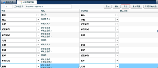 通過設置狀態(tài),角色,目標狀態(tài),設置缺陷流程,點擊“保存”完成缺陷流程的定制。