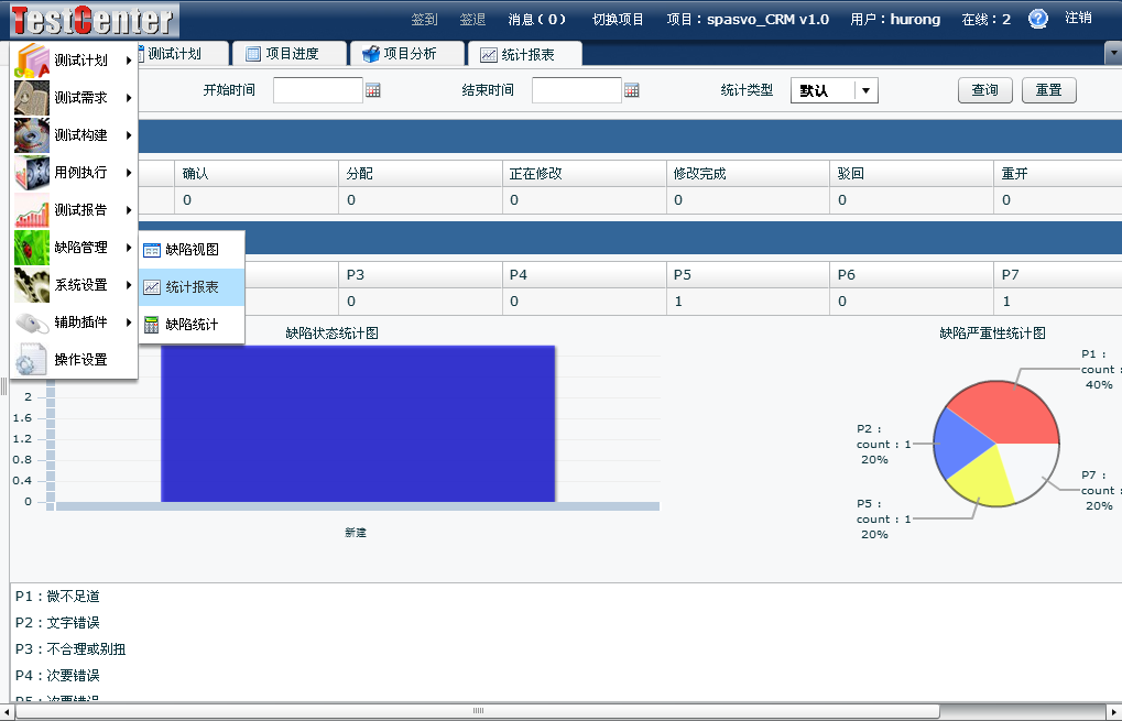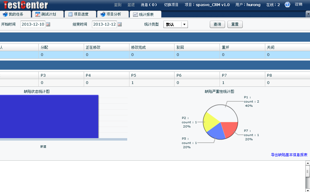 在【缺陷管理】--【統(tǒng)計報表】中可以看到有關(guān)缺陷的報告