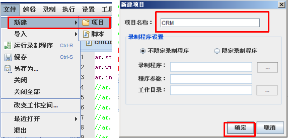 錄制腳本前新建項目和腳本,這里可以對錄制程序設(shè)置,選擇不限定錄制程序和限定錄制程序,并對程序進行相應(yīng)參數(shù)和工作目錄的設(shè)置。