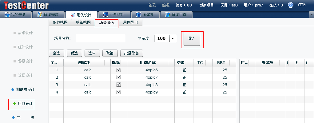 進(jìn)入“用例設(shè)計(jì)”選擇場(chǎng)景導(dǎo)入,輸入場(chǎng)景名稱(之前建立的需求名稱),點(diǎn)擊“導(dǎo)入”按鈕導(dǎo)入,用例設(shè)計(jì)完成。