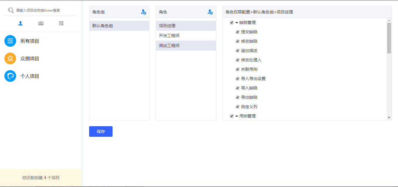 1、點擊“角色管理”; 2、選擇想要修改的角色名稱; 3、勾選或取消勾選修改角色的權限; 4、點擊 “保存”,保存設置; |