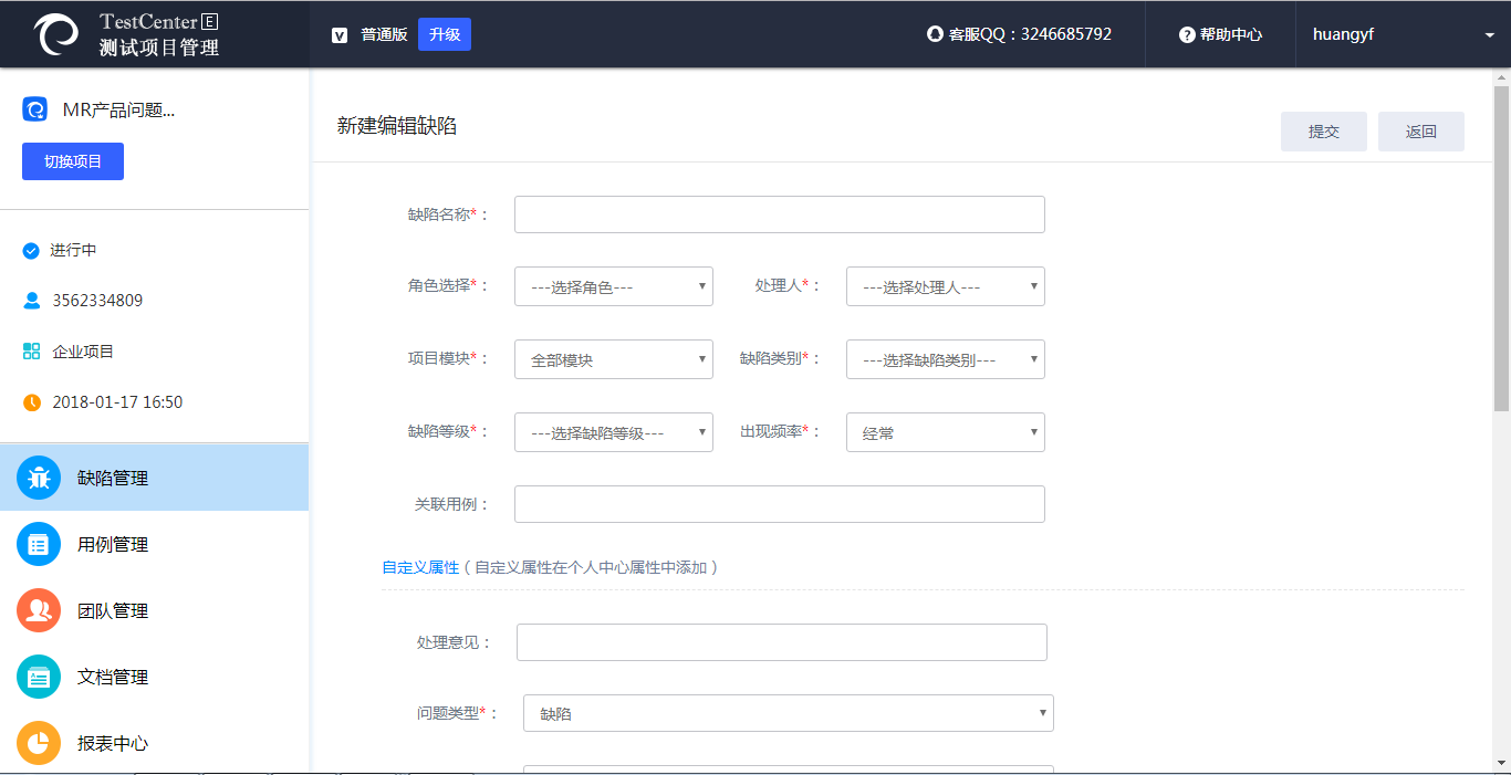 新建:【進入項目】-【缺陷管理】-【新建缺陷】 |