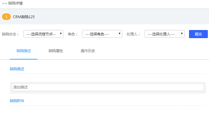 用戶在缺陷列表點(diǎn)擊缺陷名稱,右側(cè)切出缺陷詳情頁。該頁可用于處理缺陷、追加描述、查看缺陷詳情及歷史操作等信息。