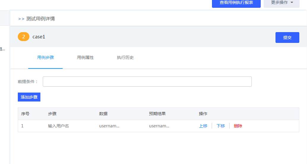 1、點擊用例名稱進入用例詳情 2、點擊添加步驟進行用例步驟添加 3、點擊提交,提示保存成功 |