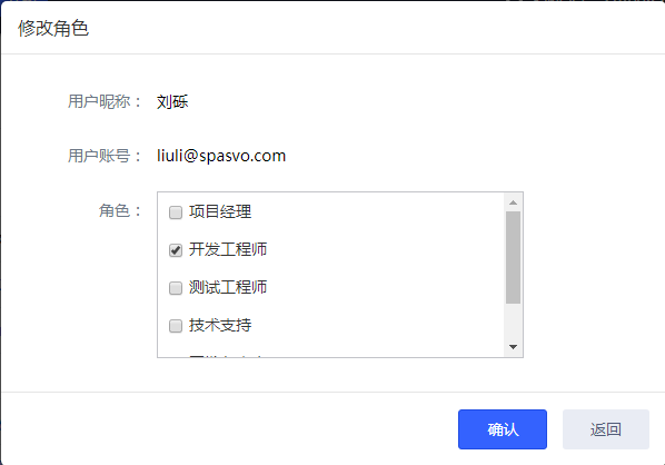 1)點(diǎn)擊“修改角色”,出現(xiàn)上圖提示框; 2)通過(guò)勾選角色,修改用戶角色; |